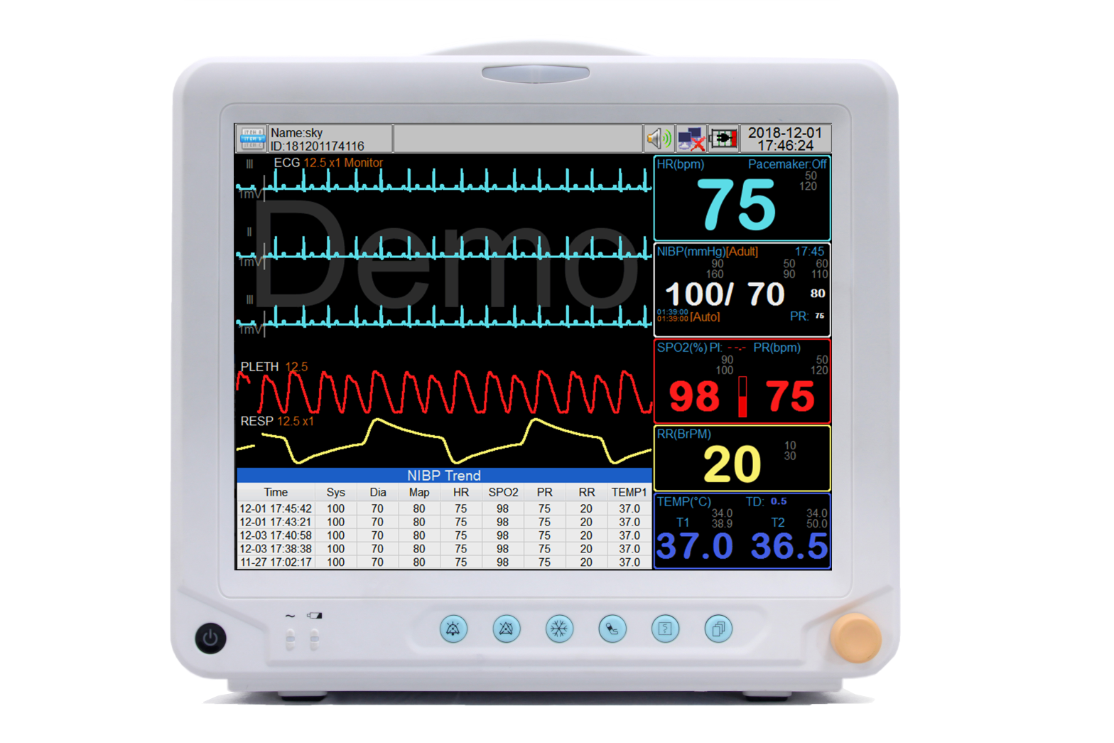 Configuration Standard : ECG 3/5 dérivations, NIBP, SpO2, Fréquence Cardiaque, Température, Respiration, Indice de Perfusion (PI)